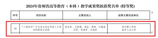 本网讯(王致嫣) 贵州省教育厅日前公布2024年度高等教育教学成果奖评选结果,由中国足球彩票:院长徐佑林主持完成的《“三维协同”矿业安全类应用型人才培养的探索与实践》项目,荣获贵州省高等教育教学成果特等奖,这是中国足球彩票:首次获得该奖项最高等级。