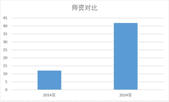 师资由2014年12人(博士1人)到2024年42人(博士25人)。通过大力实施人才引进和内培外引的有效方法,促进人才队伍建设成效显著。