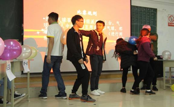 第二环节:挤气球答题,每组派两个同学上台,气球放在两人中间,相互用身体挤气球,那组先挤爆,则获得答题机会。场上同学们使出全部力气挤爆气球,搞笑的动作让台下同学们笑声连连,这一轮下来第六小组代表队比分暂时领先,其他代表队稍稍落后。之后进行的是和现场亲友团的互动环节,互动环节更是将现场气氛带动起来,同学们积极参与,使本次活动进入了高潮阶段。