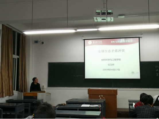 伍院长为大家讲述了全球生态的矛盾冲突,其中主要内容有:全球生态矛盾冲突的内涵、表现形式、根源以及化解矛盾冲突的基本途径;伍院长把这些内容逐一为大家详细分析,让大家了解到当前环境的严重性,呼吁大家应用自己的实际行动来保护我们共同的家园。同时,她给大家讲述了一些只顾发展不注重生态环境的国家遭受的环境的惩罚,致使本国人民受到伤害的事件,比如1956年日本水俣病事件以及1952年的伦敦烟雾事件,这些都让无辜的人民身体健康受到了严重危害。