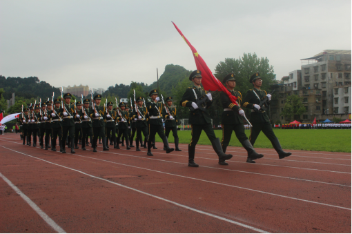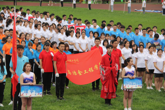 开幕式在慷慨激昂的运动会进行曲中拉开序幕,首先入场的是国旗护卫队,他们穿着整齐的绿军装,踏着铿锵有力的步伐接受检阅,随后十五支方队依次出场。其中,材料学院方队高举院旗,喊着“化物成才,引领未来”的激昂奋进口号入场;“材成天下,料汇八方,能文能武,气宇轩昂”,展现了我院学子的青春活力和自信满满。