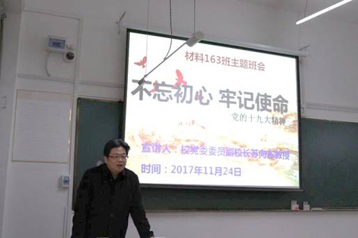 2017年11月24日,校党委委员,副校长苏向东教授来到指导班级——材料163班进行“知勤知勉永奋斗,修心修业为国家”的十九大精神宣讲。