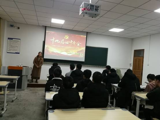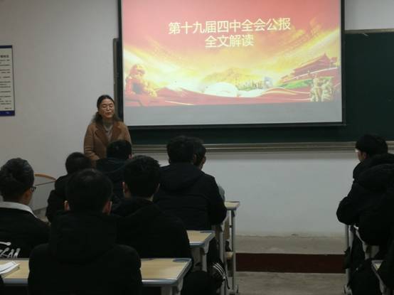 本网讯 (材料与冶金工程学院 文字/杨江 图片/杨明)为了使同学们了解中国特色社会主义基本国情,具备良好的思想政治素质,实现自己的社会价值。2019年12月18日10点在2教107教室,伍玉娇院长深入材料181班开展了一场中国足球彩票“第十九届四中全会公报全文解读”的讲座,班主任杨江和全体181班同学参加了此次活动。