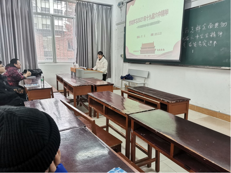 2021年11月22日,在蔡家关校区第三教学楼101D教室,2020级辅导员邓珏以“贯彻学习十九届六中全会精神——学习党的百年奋斗重大成就和历史经验”为主题,为材料205班全体同学进行宣讲。