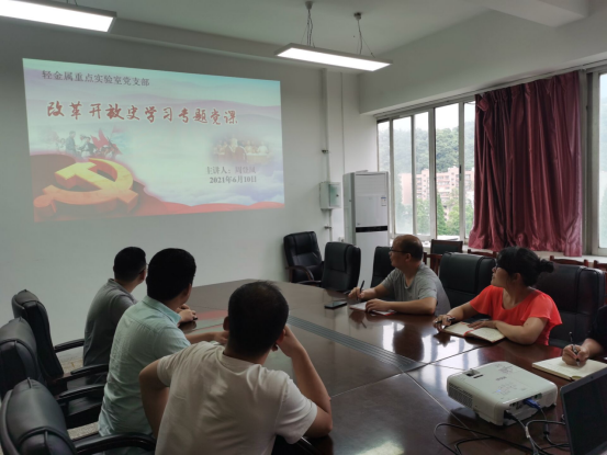 本网讯(材料与能源工程学院文字/李杰瑞 图片/罗大军) 2021年6月10日下午在802会议室,材料与能源工程学院党总支统战委员、副院长周登凤同志为轻金属重点实验室党支部党员上专题党课,主题是改革开放史。