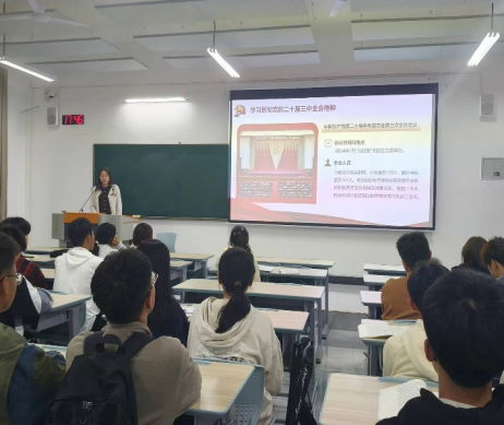韩青老师阐释了党的二十届三中全会精神,分析了全面深化改革的时代蓝图,解读了新征程推进中国式现代化的时代任务,并结合当代青年的责任与担当,提出三点要求,一是要提高政治站位,增强“四个意识”,坚定“四个自信”,做到“两个维护”,将思想和行动统一到党的二十届三中全会精神上来;二是要砥砺专业素养,把全会精神转化为自身能力,珍惜求学时光,打牢专业基础,提升综合素质,为推进中国式现代化积聚青春动能;三是要强化责任担当,发挥青年先锋作用,敢于吃苦奉献,形成强大的凝聚力和向心力,以过硬的本领为担当责任提供有力支撑。