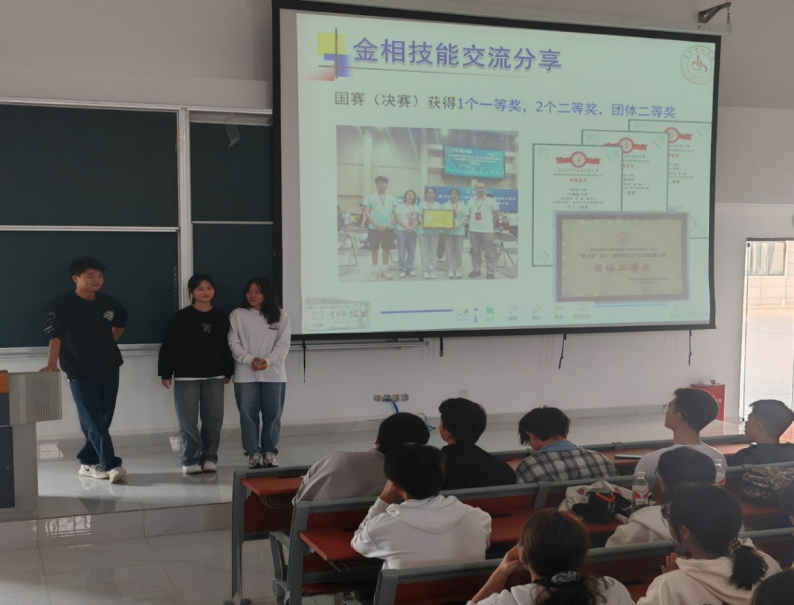 最后邀请了在上届全国大学生金相技能大赛决赛中获奖的任顺超、丁卓玉、肖茜娴3位同学分享了他们在平时训练和比赛中的经验和体会,并与在场同学进行交流。