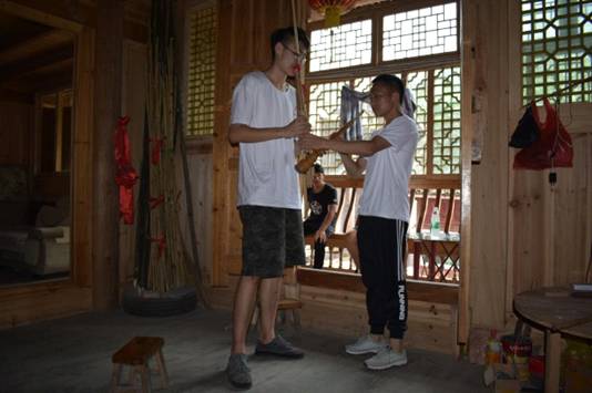 本次团队人员共七人,均由我院同学组成,早上辗转200多公里经过5个多小时到达目的地,中午稍作休息后,进行我们的第一站:学习芦笙工艺制作流程。芦笙是苗族文化的一种符号和象征,是表达民族思想感情的纽带,是苗族人民奋进向上的精神支柱。在一位村名的指引下不久来到了一户芦笙制作传承者家里,队员细致入微的听芦笙制作老人讲述制作技艺,它由带簧笙管、笙斗、吹管和共鸣筒组成。大概制作过程是先要做“芦笙本”,其次是烘干,然后点铅,修饰,最后才是成品,芦笙师傅告诉队员们在这几步中,第一步是最难的,工序是很复杂的,也最耗时间。讲述完毕后,队员们按捺不住想试一试,队员接过芦笙老师傅制作的芦笙对着口按老师傅的指示吹出了美妙的声音,当场齐刷刷地响起掌声。夕阳无限好,只是近黄昏,不知不觉时间就过去了,最后大家告别芦笙老师傅回到住宿的地方,芦笙美妙的声音依然环绕在心中。