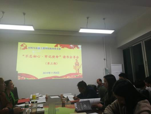 本网讯 (材料与冶金工程学院 李杨/文字 李杨/图片)根据学校“不忘初心、牢记使命”主题教育中对照党章党规找差距的有关文件精神和安排,2019年11月8日下午2:00,材料与冶金工程学院教师党支部在行政楼802会议室开展“不忘初心、牢记使命”主题教育“对照党章党规找差距”专题会议,党支部师生党员参加会议,学校“不忘初心、牢记使命”主题教育巡回指导二组杜玉红同志到会指导,会议由学院党总支书记潘健林同志主持。