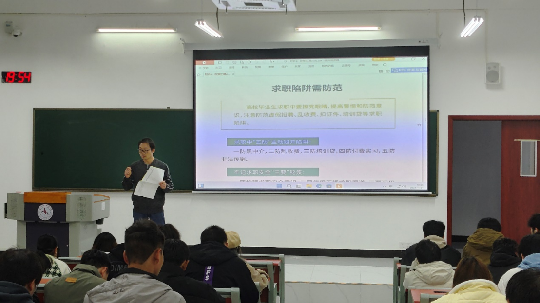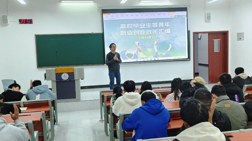 2024年11月21日晚,材料与能源工程学院开展《2024年高校毕业生等青年就业创业政策汇编》讲解及签约注意事项分析讲座,此次讲座由学院学生科副科长蔺锡柱主讲,学院100余名同学参加。