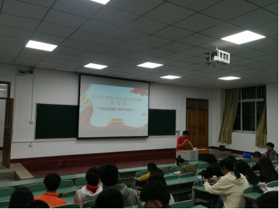 本网讯(材料与能源工程学院 文字/张茂武 图片/张茂武)为进一步引导同学们学党史知党情,2021年5月24日晚,我院邀请了贵州理工学院党史宣讲团成员-王宇维同学,在蔡家关校区2教111教室,为材料193和材料192班进行以“弘扬五四精神奉献火热青春”为主题的思想教育活动。