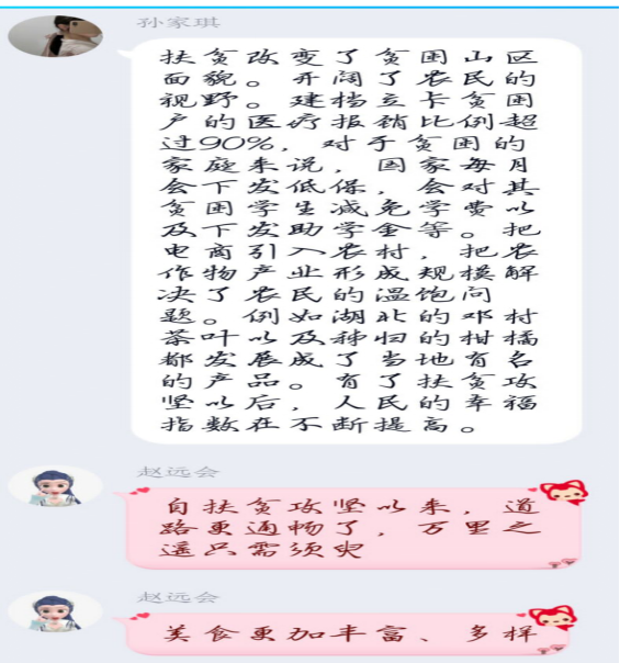 “特殊”时期,以“特殊”形式开展的道德讲堂,虽然不能面对面的交流,但现场气氛仍然热烈,效果良好,同学们从中深刻体会到了脱贫攻坚的意义。活动后,同学们在腾讯课堂中为秦庆东献上了鲜花,并且对这次讲堂发表了自己的感想,感慨脱贫攻坚的重大意义和取得的伟大成果。