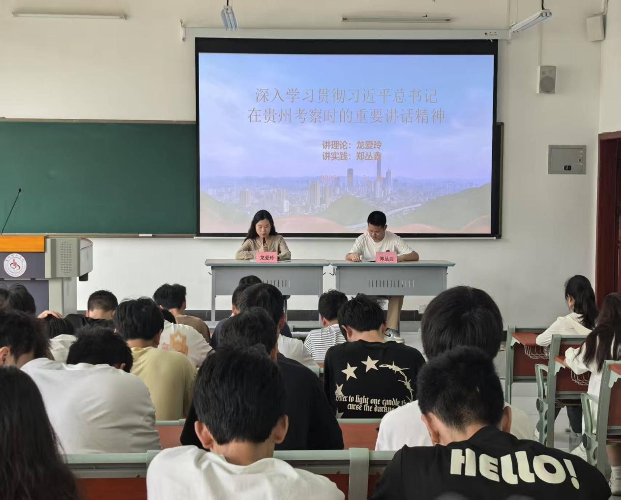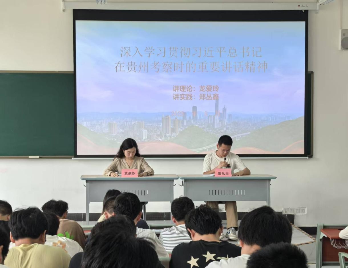 为深入学习贯彻习近平总书记在贵州考察时的重要讲话精神,推动理论学习走深走实,2025年5月22日,材料与能源工程学院在敏学楼102教室举办“理论宣传二人讲”活动。本次宣讲由马克思主义学院龙爱玲老师、2021级学生郑丛鑫主讲,学院80余名学生参加。