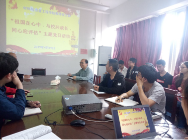 在学校迎来建校6周年和本科教学工作合格评估进入关键时期之际,为大力弘扬爱国爱校奋斗精神,推动党支部和支部党员在迎评促建中建功立业,全力迎接合格评估,确保学校顺利通过合格评估,材料与冶金工程学院教师党支部于2019年4月19日开展“祖国在心中·与校共成长·同心迎评估”主题党日活动。