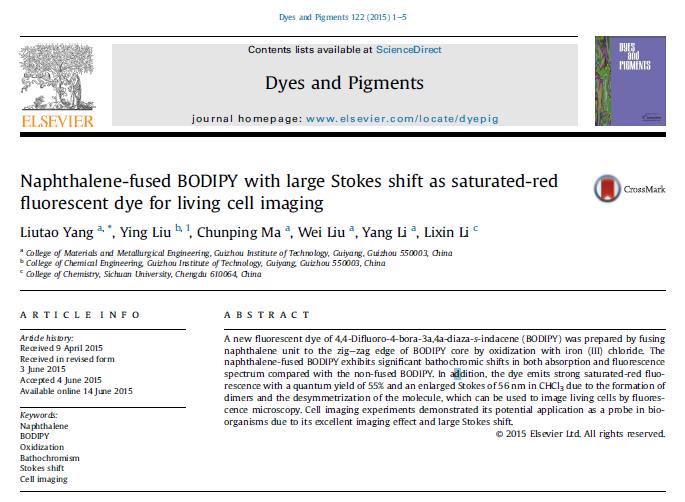 我院杨柳涛老师的研究论文“Naphthalene-fused BODIPY with large Stokes shift as saturated-red fluorescent dye for living cell imaging”,被“Dyes and Pigments”接收。“Dyes and Pigments”是工程技术领域的SCI期刊,JCR二区期刊,2014-2015年影响因子为3.966。