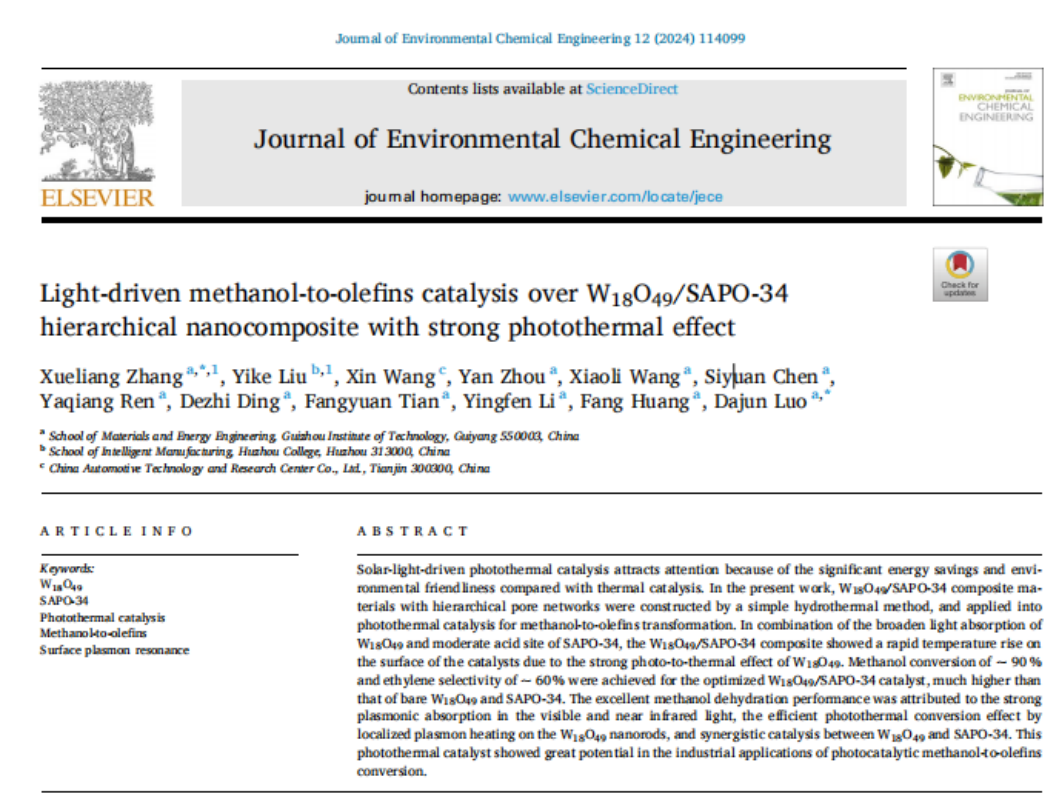 日前,贵州理工学院材料与能源工程学院张学亮以第一作者身份在国际期刊??《Journal of Environmental Chemical Engineering》(JCR1区,影响因子IF=7.4)上发表题为《Light-driven methanol-to-olefins catalysis over W18O49/SAPO-34 hierarchical nanocomposite with strong photothermal effect》研究论文,并被Web of Science数据库检索。
