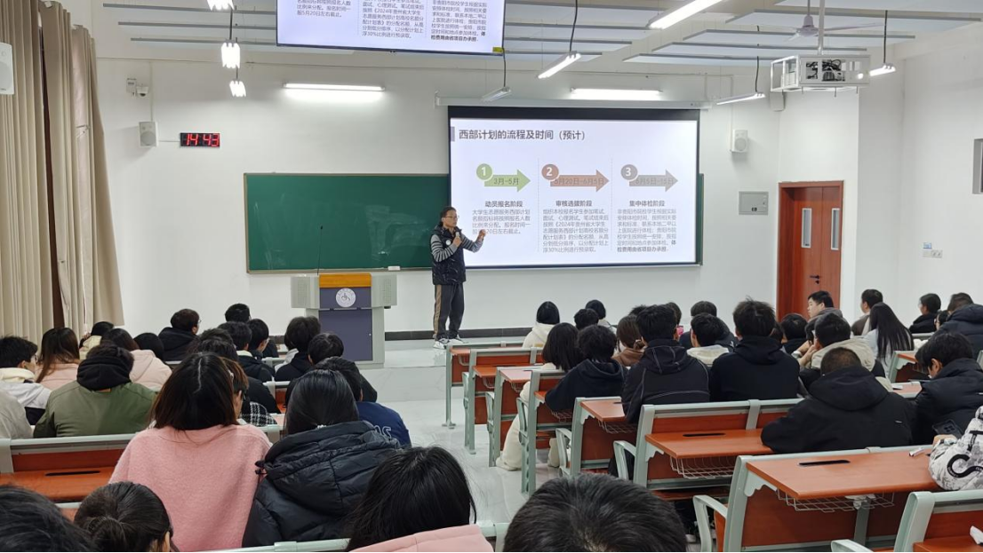 为做好2025年大学生志愿服务西部计划招募及应征入伍宣传工作,弘扬“奉献、友爱、互助、进步”的精神,引导广大青年学子积极响应国家号召,深入基层、携笔从戎,到祖国需要的地方建功立业,2025年3月13日,在B01-102阶梯教室举行2025年西部计划及应征入伍政策宣讲,共100余名学生参加。