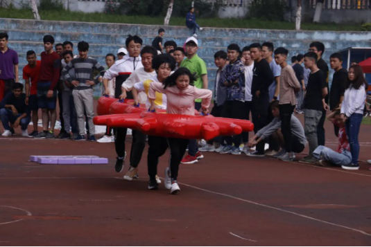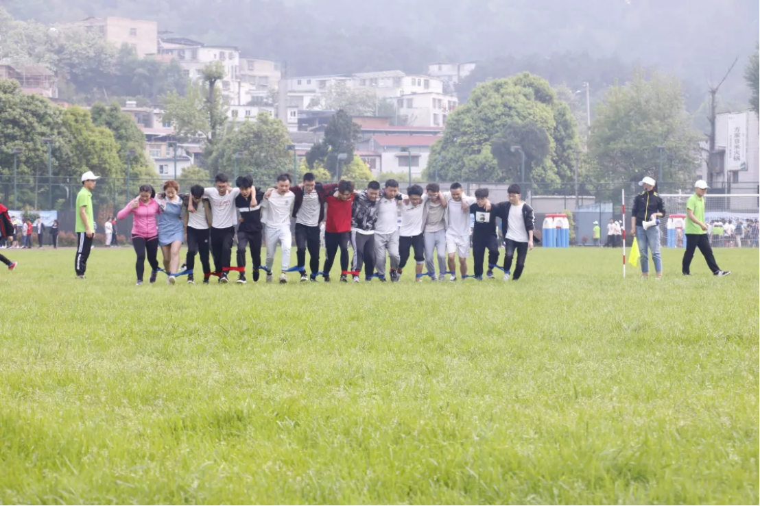 上午一开始的趣味项目充满了乐趣,让人笑声不断,软式跨栏接力,十五人三十米绑腿跑,趣味组合接力等,这些都极考验运动员们的团结与合作能力,各个团队相互竞争,团队内成员相互加油打气,让我们看到了团队合作力量之强大。