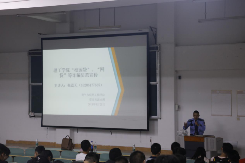 (本网讯电气与信息工程学院张佳鹏/文 申雯源/图)为提升学生预防电信诈骗的能力,增强安全防范意识,切实保障广大学生的利益,维护校园安全稳定。对此,在2019年4月29日,我院团总支学生会学习部在3教415组织开展了防诈骗防网贷专题讲座。此次讲特别邀请了蔡家关派出所张蓝天同志,同时作为主讲人的还有电自183班的郭睿。