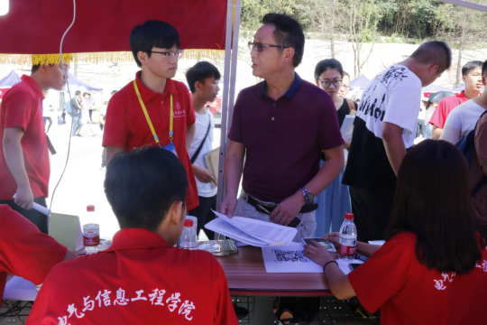 (本网讯 电气与信息工程学院 图/高祥、董云华 文/张劲松)9月14日,贵安校区彩旗翩翩,丹桂飘香,欢声笑语,人潮涌动,我院400余名2019级小萌新从祖国各地来到贵州理工学院,开启新的征程,追逐新的梦想。学院领导王婷婷、蒋学勤、龙飞、张均、周新国到迎新现场指导迎新工作并与新生家长深入交流,学院学生科辅导员、新生班主任、30余名志愿者参加了迎新活动。