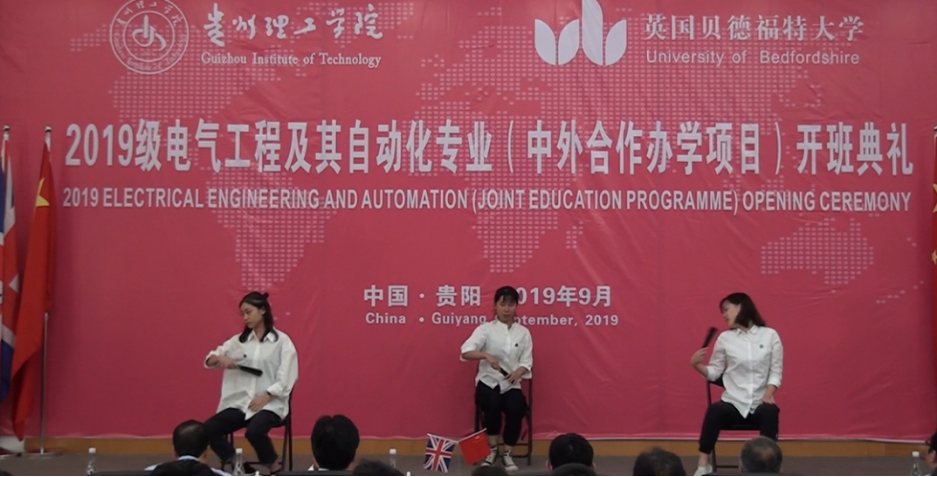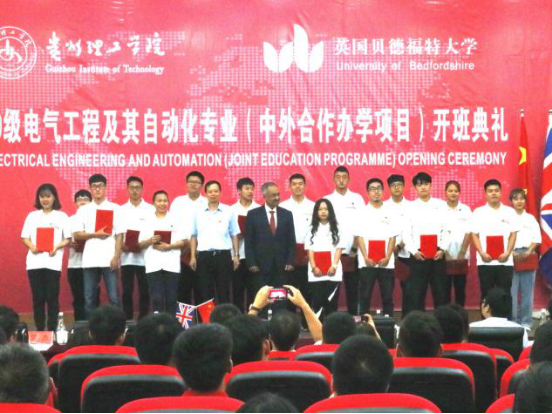 (本网讯 电气与信息工程学院 文/顾英 图/张劲松 张佳鹏)金秋送爽,丹桂飘香。2019年9月16日下午,贵州理工学院与英国贝德福特大学合作举办的电气工程及其自动化专业本科教育项目第二届新生开班典礼在中国足球彩票:蔡家关校区喀斯特报告厅隆重举行。学校党委书记曾羽、校党委副书记、副院长苏向东、副院长梁杰、副院长宋建波,以及英国贝德福特大学副校长Ashraf Jawaid、国际处处长Harry Wang、英国贝德福特大学中国办公室主任Colin Wang和教师代表出席开班典礼。学校相关职能部门负责人,学院专业老师,中外合作班辅导员、班主任,以及中外合作班全体新生、部分老生和家长代表参加了开班典礼。典礼由电气与信息工程学院党总支书记王婷婷主持。