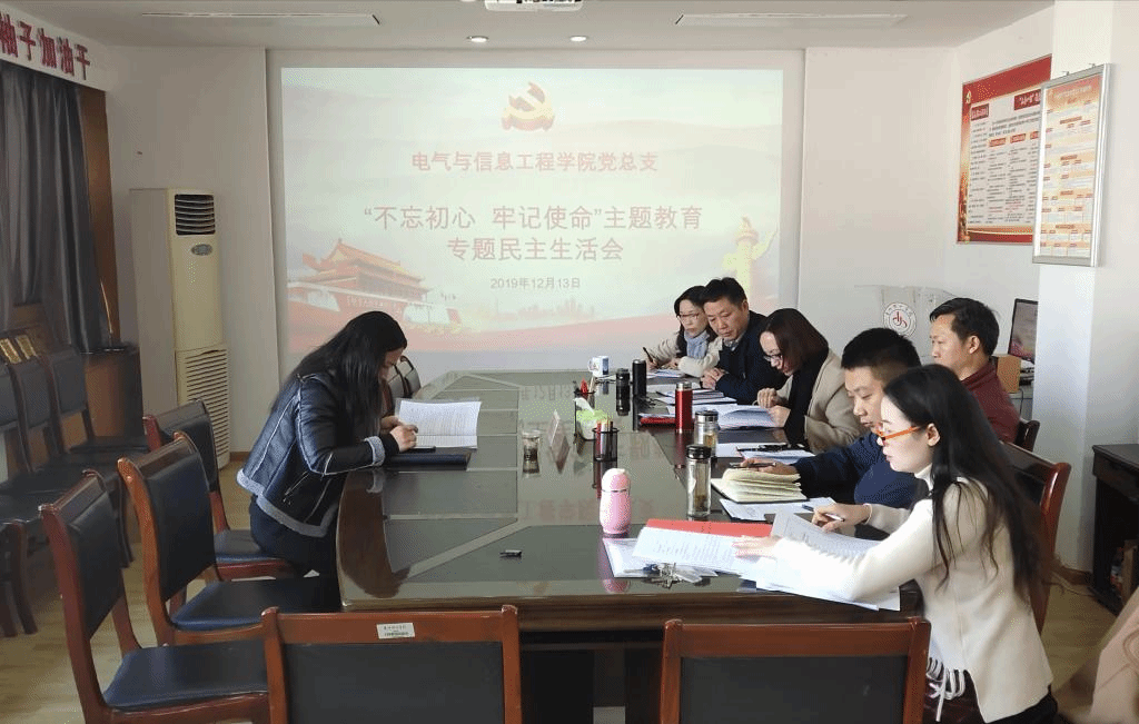 本网讯(电气与信息工程学院侯汝培)12月13日上午,我院在主楼723会议室召开党总支班子“不忘初心、牢记使命”专题民主生活会。学校第四巡回指导组员谢述琼到会指导,学院党总支班子成员参加会议。会议由党总支书记王婷婷主持。
