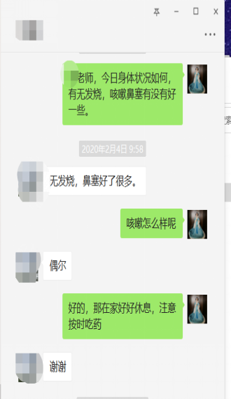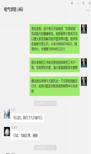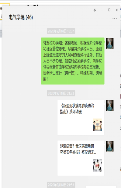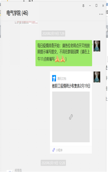 除了每天的排查,作为办公室负责人的她,及时的将学校、学院的相关通知精神传达给每位教师和学院领导,对老师们关心和不清楚的问题给予回复和解答,自己不清楚的马上与相关领导和部门咨询并回复给老师们;给外地返回贵阳的教职工发送温馨提示,在工作群转发疫情相关便民链接,方便老师们的居家生活和查询,减少外出防止感染;提前思考安排做好开学疫情后勤保障工作。