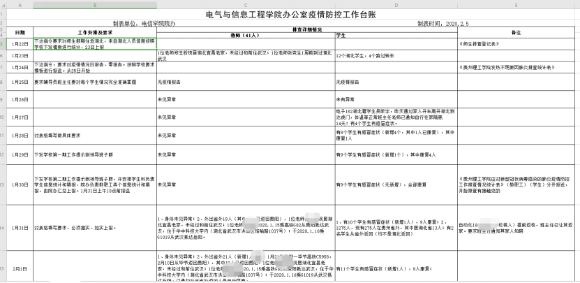 本网讯(电气信息工程学院)对于电气与信息工程学院办公室副主任刘帆来说,今年的春节注定是个不平凡的春节,因为这是她第一次留在贵阳过年。然而,在1月22日当天,正在筹备年夜饭的她,收到来自学院领导的电话,要求马上开展疫情排查工作,从这天开始,她正式上岗,开始了学院的疫情防控工作。