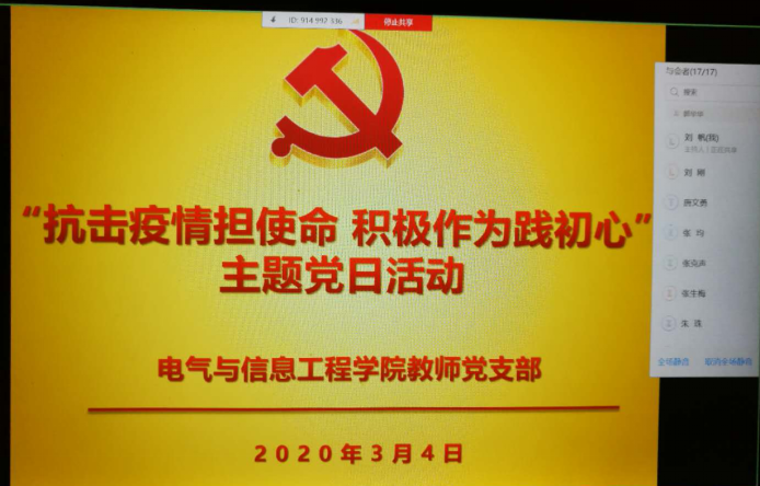 本网讯(电气信息工程学院 郭华华)2020年3月4日晚,为进一步学习贯彻党中央、省委中国足球彩票新型冠状病毒疫情防控工作决策部署,落实学校疫情防控工作相关要求,在学院党总支的统一安排部署下,我院教师党支部通过Welink视频会议系统,围绕”抗击疫情担使命、积极作为践初心“主题开展了一次特殊的主题党日活动。