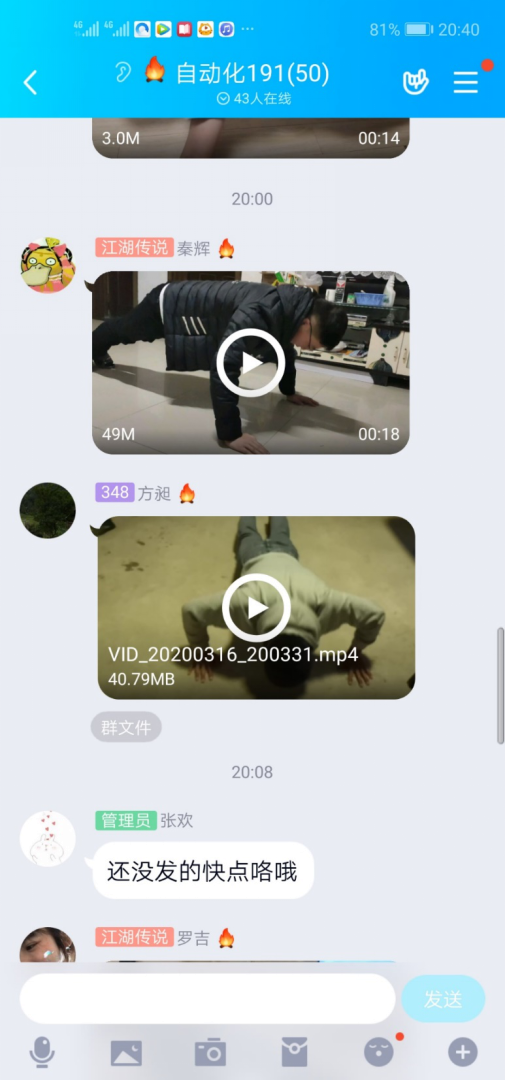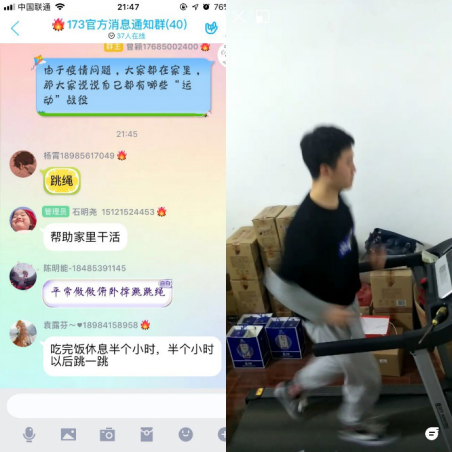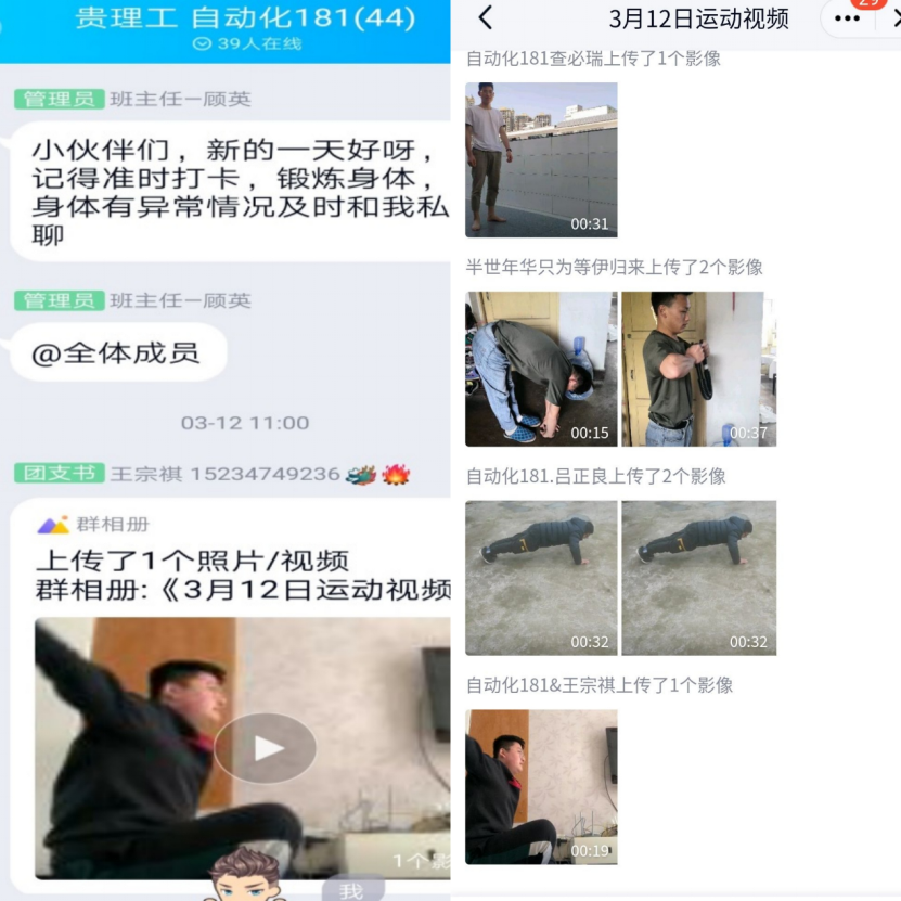 其中,来自电自181班的朱睿斌这样说道:谁也想不到在家中上课这种愿望也能实现,人在家中坐,书从网上来。当然面对疫情,我们不得不这样做,家中久坐读书,一天下来腰酸背疼,被窝里、沙发上的姿势无所不有。二十岁的我,四十岁的身体,因此决定每天坚持锻炼,keep在手,腰酸背疼快远走!家里太小不能跑,原地高抬腿、仰卧起坐、俯卧撑样样在行。同时做好表率,带动寝室同学消灭肥肉,一起走向八块腹肌之路!