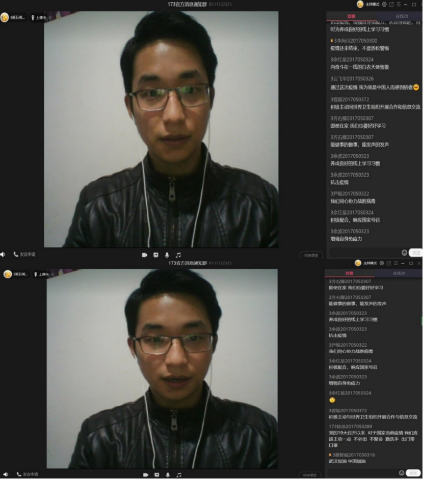 (自动化173班石明尧同学通过QQ群课堂的形式,围绕“我和我的祖国.坚决打赢疫情防控阻击战”进行了深情演讲)