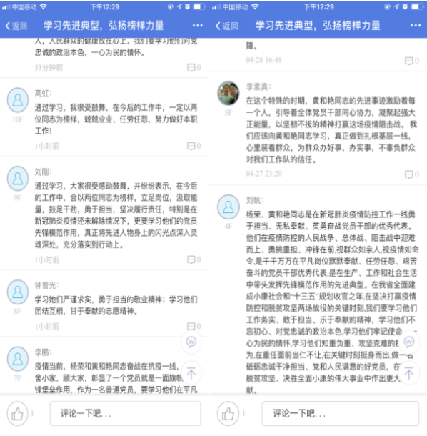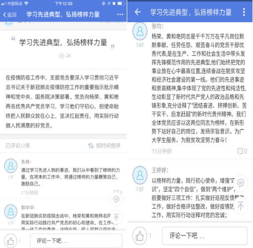 在学习强国平台上,支部全体党员学习了《中共贵州省委中国足球彩票追授杨荣、黄和艳同志“全省优秀共产党员”称号的决定》《疫情不退我不退---贵州省江口县纪检监察干部杨荣连续奋战23天牺牲在抗疫一线和倒在战“疫”一线》《新时代女性精神在战“疫”中熠熠生辉》,并在易班支部微社区发表了自己的学习体会。