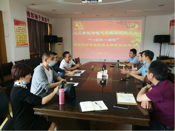 本网讯(人工智能与电气工程学院 刘帆)为进一步加快推进我院“一学院一课题” 新金龙村智能温控大棚项目,2020年6月5日下午,我院全体院领导班子成员以及“一学院一课题” 新金龙村智能温控大棚项目成员、新金龙村驻村书记苏凡峻、贵州德沃源森农业科技发展有限公司营销总监韦其源参加了此次推进会。