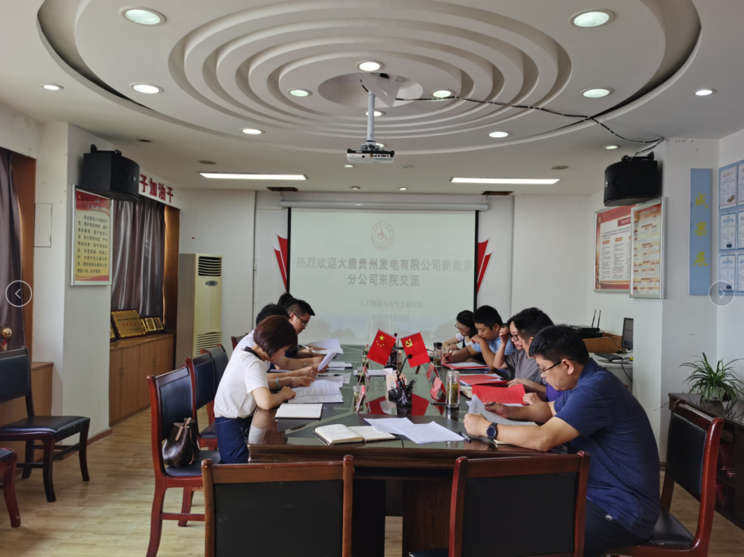 本网讯(人工智能与电气工程学院 顾英)7月20日上午,大唐贵州发电有限公司新能源分公司副总经理刘晓春一行莅临我院就 “大唐定制班”合作相关事宜进行深度沟通和交流,学院党总支书记王婷婷、副院长张均、党总支副书记周新国及各科室负责人参加会议。