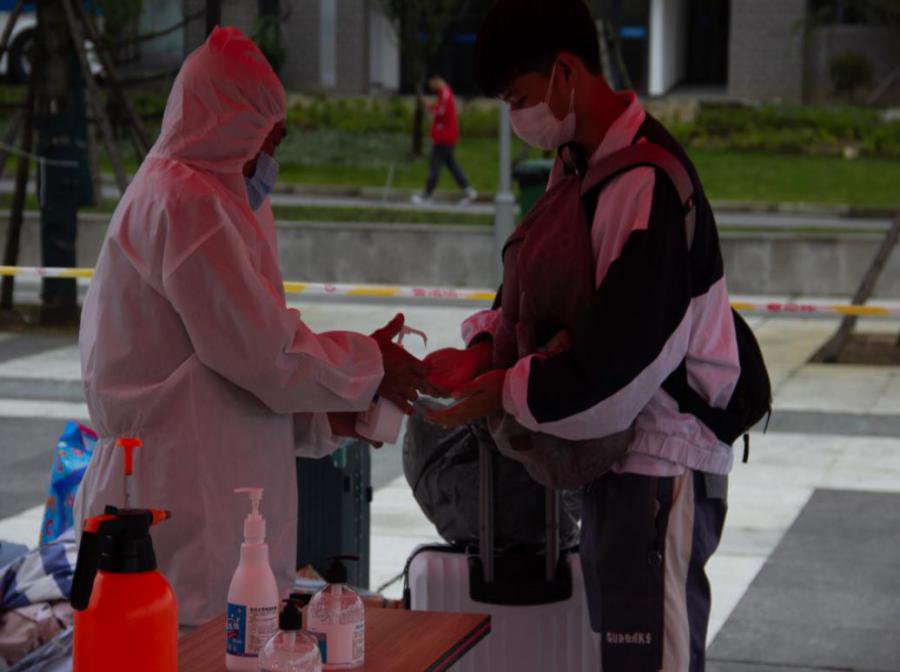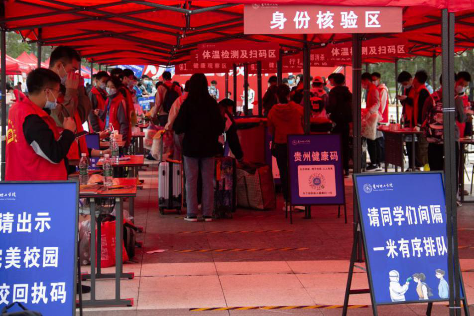 为确保学生安全,新生经过身份核验、体温检测、行李消杀等一系列疫情防控安全措施后进入校园。随后志愿者引导每一位新生顺利办理宿舍登记、交费、军训服装领取等入学手续。