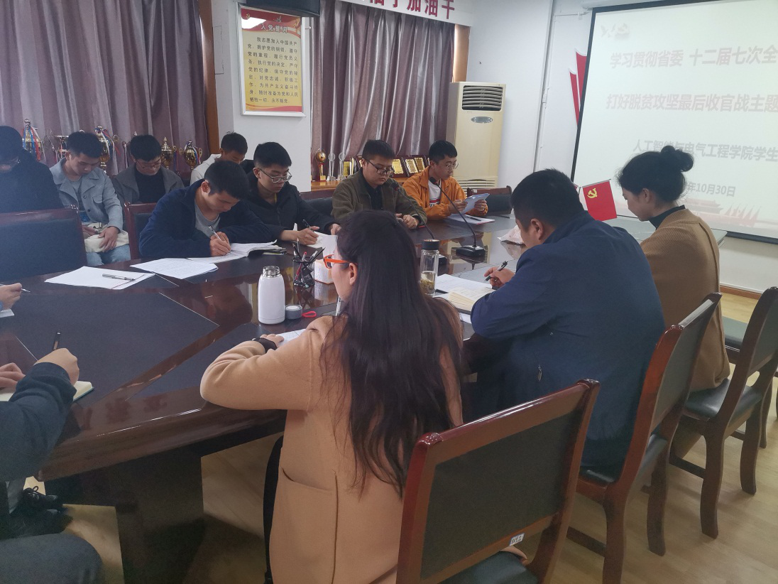本网讯(人工智能与电气工程学院 邓新发)2020年10月30日,学院学生党支部在行政楼723会议室开展“学习贯彻省委十二届七次全会精神 坚决打好脱贫攻坚最后收官战”主题党日活动,活动由支部书记郑玉娇主持。
