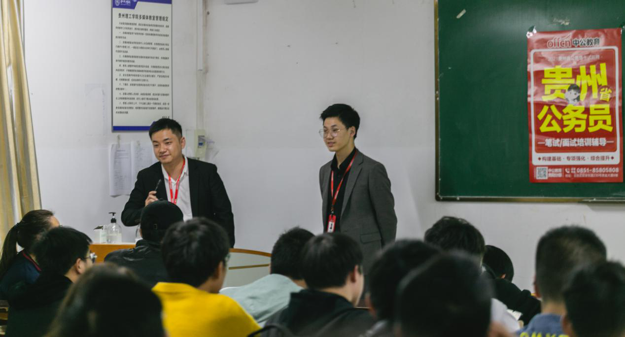 本网讯(人工智能与电气工程学院 李伦)为使学生个人对未来职业走向和职业发展有更清晰的认识,同时提高学生的综合素质,避免学习的盲目和被动,帮助同学们对自己的职业目标和实施策略更加明了。2020年11月12日晚19:30,我院于3213教室开展了职业规划讲座。本次活动由贵州中公教育刘凯勋、杨朝厅讲师主持。