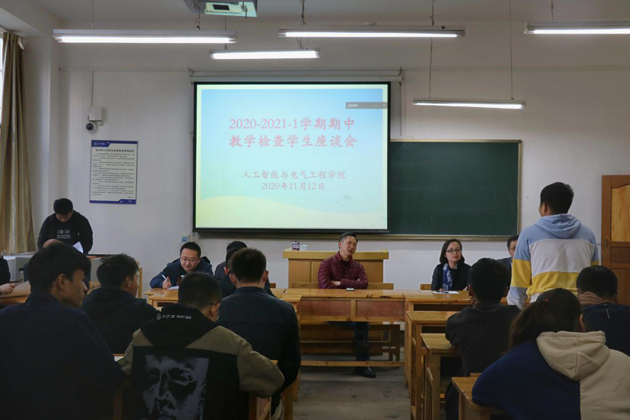 本网讯(人工智能与电气工程学院 陈勇)为了更好的开展教学工作,聆听学生的建议和意见,进一步改善学生生活,提高教学质量。11月12日中午,我院在第一教学楼107教室召开了本学期期中教学检查学生座谈会,出席本次座谈会的有我院党总支书记王婷婷、副院长龙飞、副院长张均,各教研室负责人、学生科、教务科全体老师及各班学习委员和学生代表参加本次座谈会。