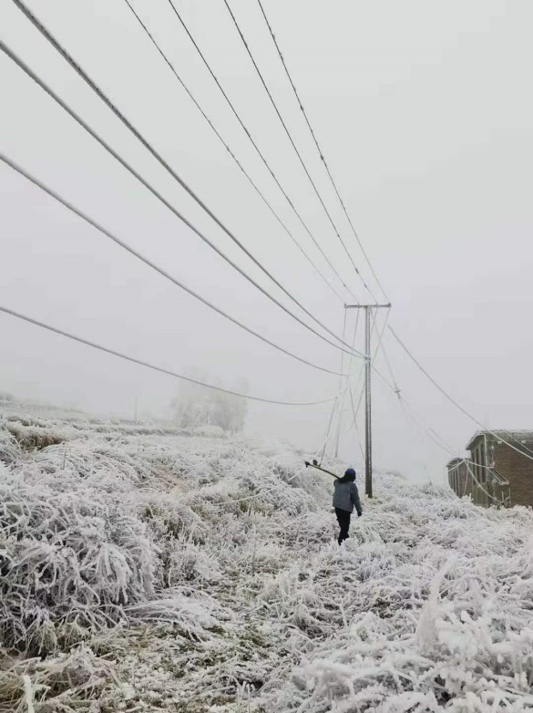 这群电力人2020年7月从贵州理工学院毕业,脸上还未退下学生的稚气,从事电力行业不到半年的时间,却扛起了保电的重要责任。原电自162班副班长马关虎,每天背着工具包,和其他电力人一样在威宁黑土河镇坪山中黑二回400V\220V线路巡线。工作地海拔2000米,气温零下5度,在北风口处覆冰严重,马关虎和同组工作人员采用手动除冰工作里,保障供电线路的正常工作。尽管天气寒冷,每天巡路程高达20多公里,这群刚入职的理工人秉承艰苦奋斗,责任担当的精神,兢兢业业地做好工作。保电,永远在路上。