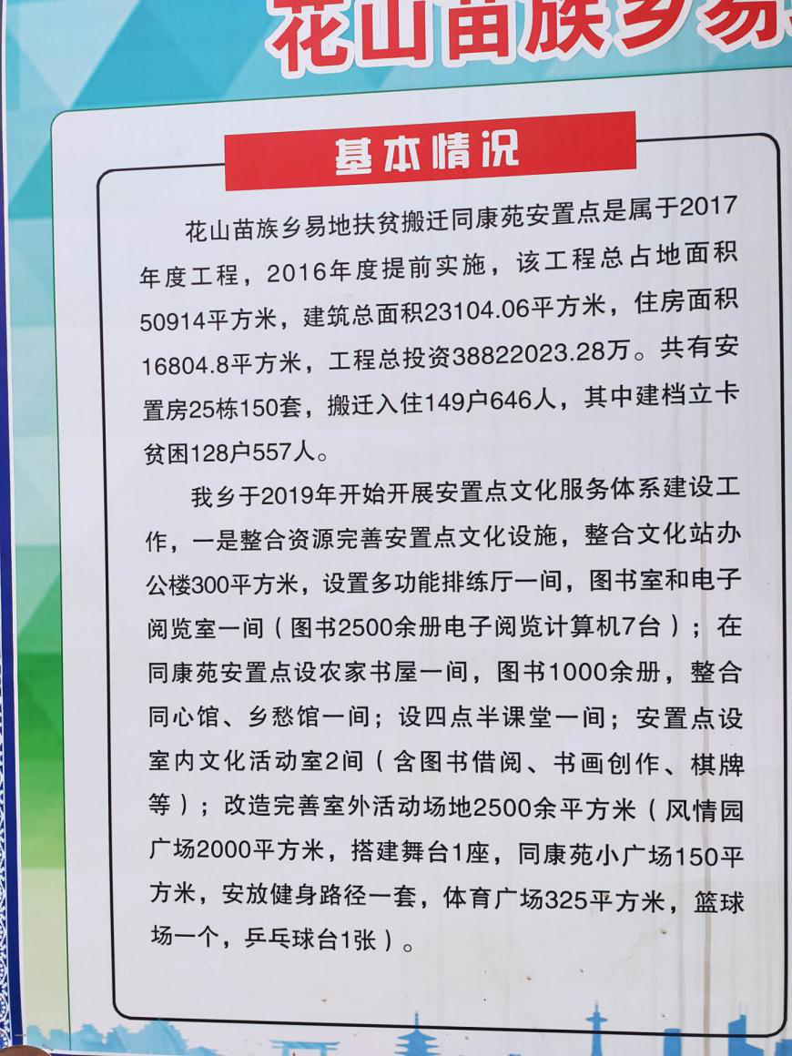 花山苗族乡同康苑安置点调查小组通过宣传板了解到,花山苗族乡易地扶贫搬迁同康苑安置点是2017年的安置点工程,于2016年提前实施,该工程总占地面积50914平方米,建筑总面积23104.06平方米,住房面积16804.8平方米,工程总投资38822023.28万。共有安置房25栋150套,搬迁入住149户646人,其中建档立卡贫困128户557人。