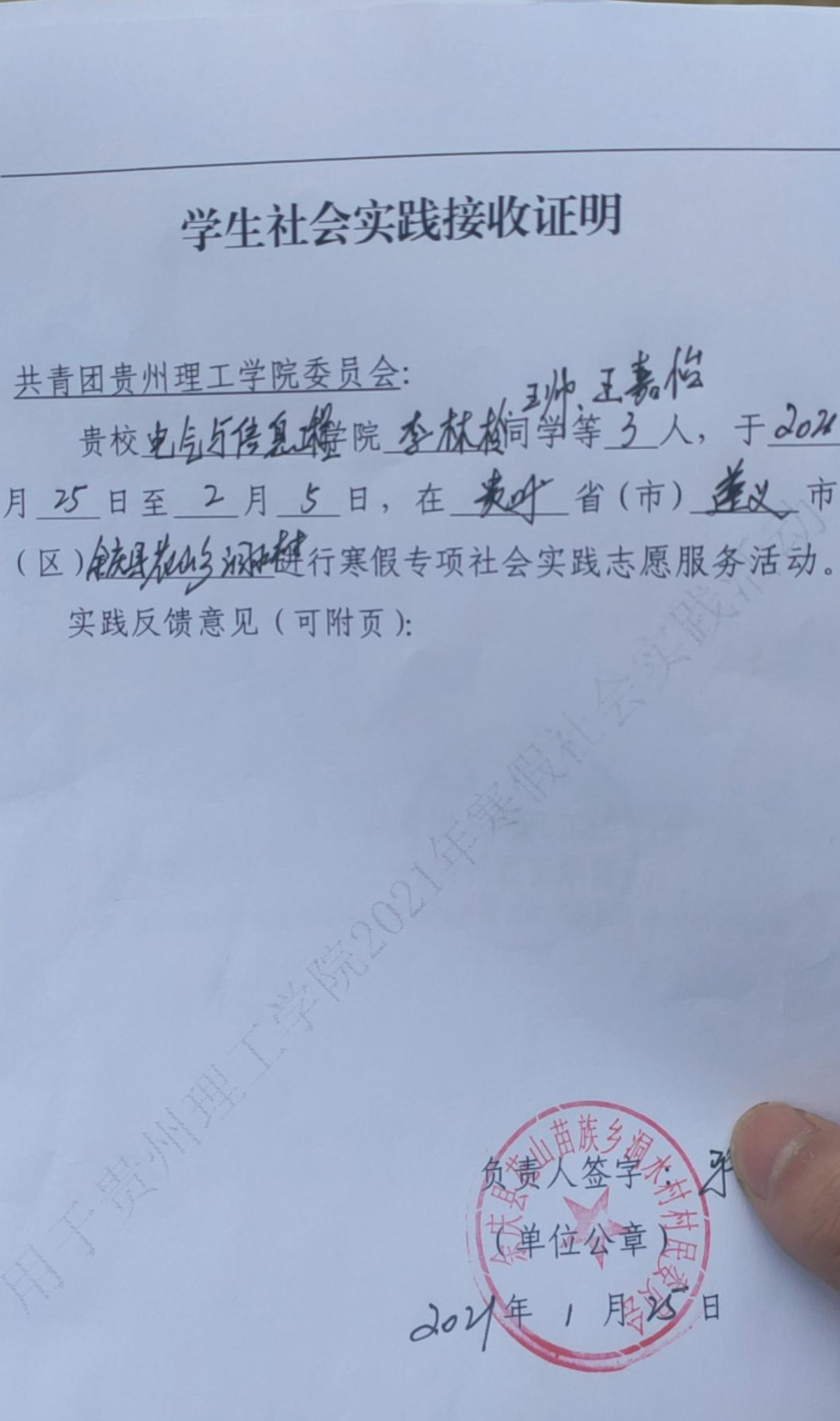 为响应学校脱贫攻坚号召,增强学生实践能力,我院“花山苗族乡同康苑安置点调查小组”在做足了前期准备工作的前提下于2021年1月25日前往贵州省遵义市余庆县花山苗族乡洞水村同康苑易地扶贫搬迁安置点展开实地调研。花山苗族乡同康苑安置点调查小组由智电学院电自191李林伶、电自181王帅和电自191王嘉怡三位同学组成,指导老师为智电学院郑玉娇老师。