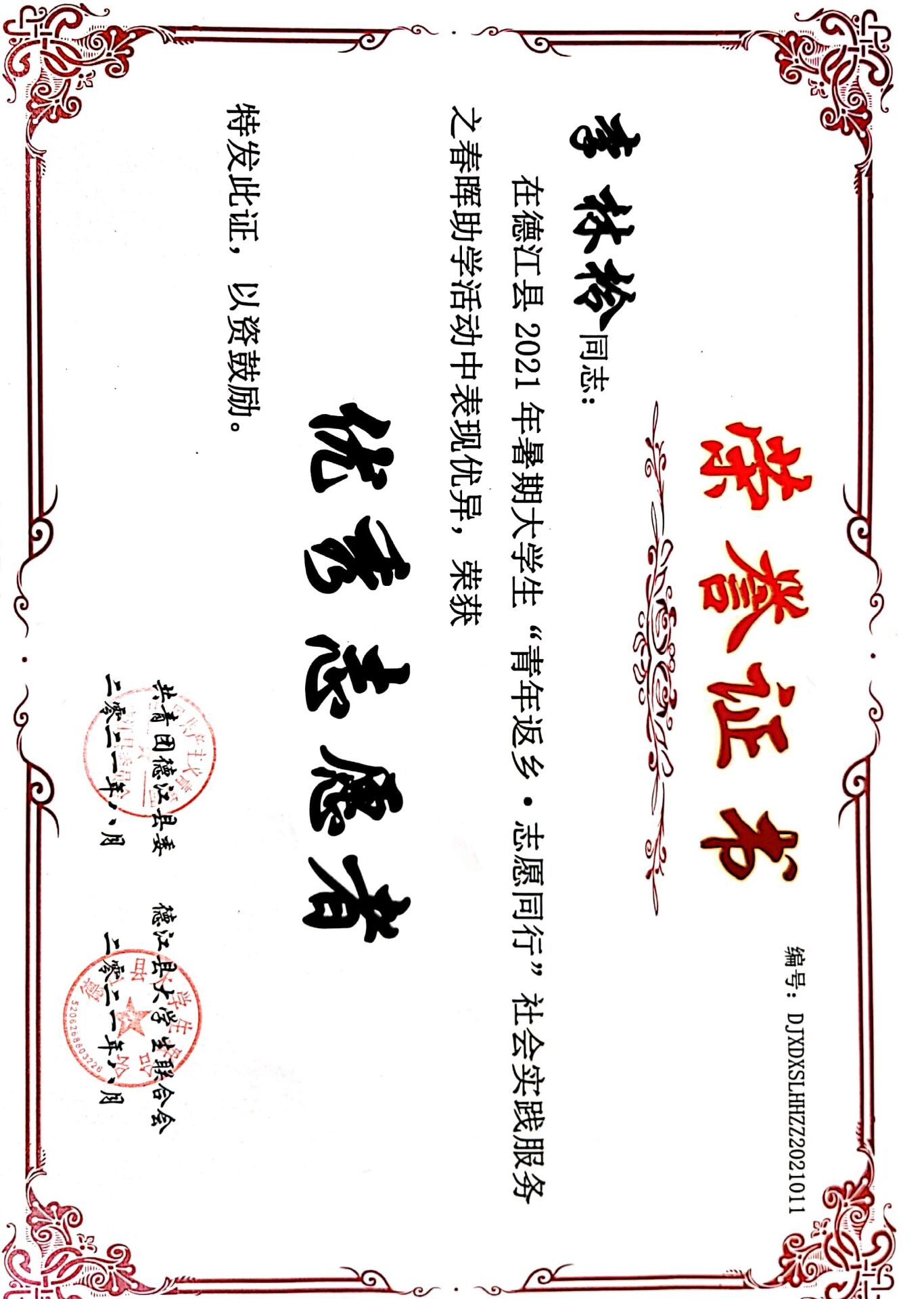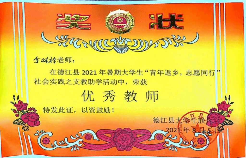 在这活动期间,我院同学积极参与,认真负责,不忘初心,艰苦奋斗。积极树立“有理想、有担当、有能力”理工学子形象。其中,我院同学李林柃同学先后获得主办单位共青团德江县委授予的“优秀志愿者”、承办单位德江县大学生联合会授予的“优秀教师”等荣誉称号。