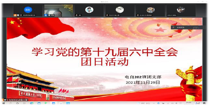 为学习贯彻党的十九届六中全会精神,11月29日人工智能与电气工程学院电自202班于线上开展“学习党的十九届六中全会精神”主题团日活动,本次主题团日活动由我院团总支顾英老师面向同学们开展“党的十九届六中全会精神”宣讲。