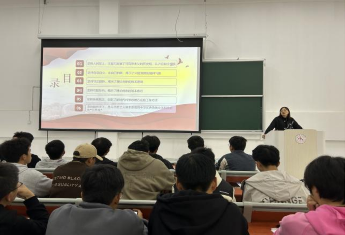 为引导学生深入学习贯彻习近平新时代中国特色社会主义思想,坚持不懈用习近平新时代中国特色社会主义思想凝心铸魂,将其转化为强大的思想武器,内化于心、外化于行,在新征程上贡献自己的青春力量。在2023年10月27日,人工智能与电气工程学院团总支陈心园老师在C02-324教室,面向电自231、233和自动化231班全体同学讲授“学习和把握习近平新时代中国特色社会主义思想的世界观和方法论 ”主题团课。