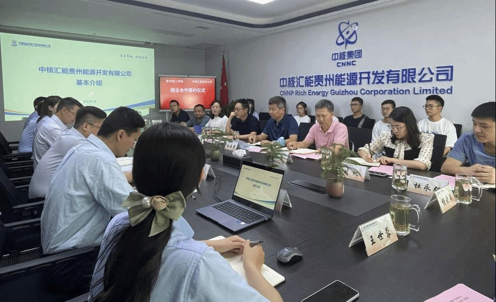2022年7月7日,贵州理工学院人工智能与电气工程学院与中核汇能贵州能源开发有限公司校企合作签约暨实习基地揭牌仪式在中核汇能贵州能源开发有限公司会议室举行。中核汇能贵州能源开发有限公司副总经理朱冬主持,学院党总支书记刘承章、院长龙飞、副院长张均,中核汇能贵州能源开发有限公司执行董事、总经理袁旭光分别讲话并见证签约。