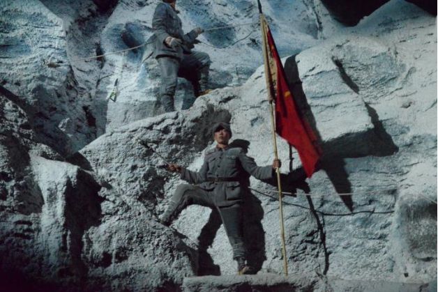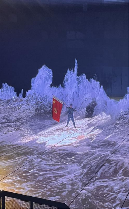 随后一面巨大的红旗在现场观众的接力传递下,从一头到达了另一头。它表达的是红军长征的伟大胜利离不开每一个参与者的无私奉献和英勇斗志。在长征途中,每一位红军战士都以顽强的意志和坚定的信念,不畏艰险、不怕牺牲,为了革命事业和国家的解放事业,付出了巨大的牺牲和努力。
