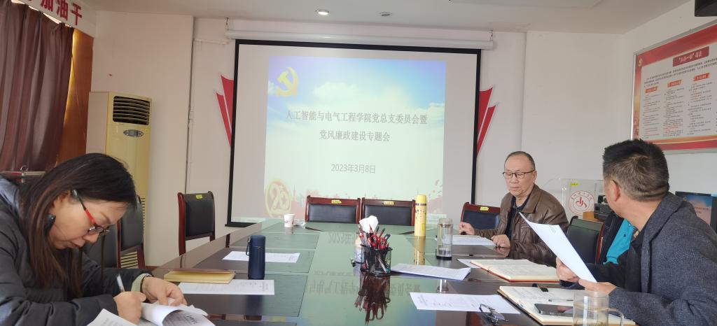 为贯彻落实中央、省委和学校党委全面从严治党的要求,切实加强党风廉政建设,严格落实党风廉政建设责任制,认真履行“一岗双责”,筑牢拒腐防变的思想防线, 2023年3月8日,人工智能与电气工程学院党总支召开了党风廉政建设工作专题会。会议由党总支副书记程星晶主持,党总支委员、各科室、教研室负责人、党支部书记参加了会议。