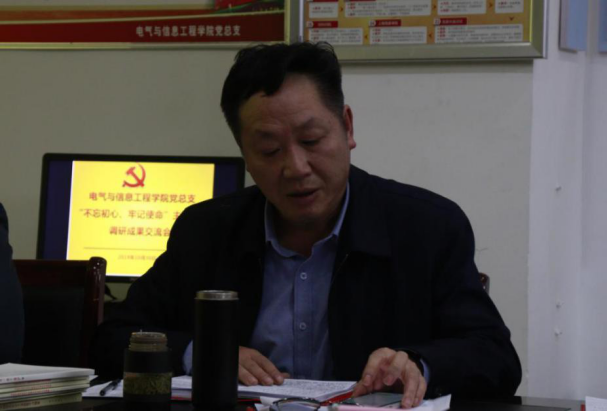 本网讯(电气与信息工程学院 文/石明尧 图/郑旭)10月30日,电气与信息工程学院党总支“不忘初心、牢记使命”主题教育第二次集中学习研讨会在723会议室举行。学校第四巡回指导组组长刘承章莅临指导并讲话,学院领导龙飞、张均、周新国出席会议,会议由党总支书记王婷婷主持。