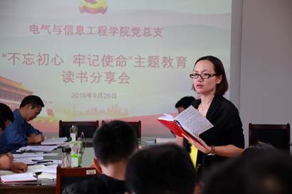 本网讯(电气与信息工程学院 图/朱德淘 文/贾芸)9月26日,我院党总支“不忘初心、牢记使命”主题教育读书分享会在主楼723召开。学校第四巡回指导组组长刘承章莅临指导,院领导王婷婷、蒋学勤、龙飞出席会议,学院党总支委员、全体师生党员共三十余人参加会议。分享会由学院党总支副书记周新国主持。