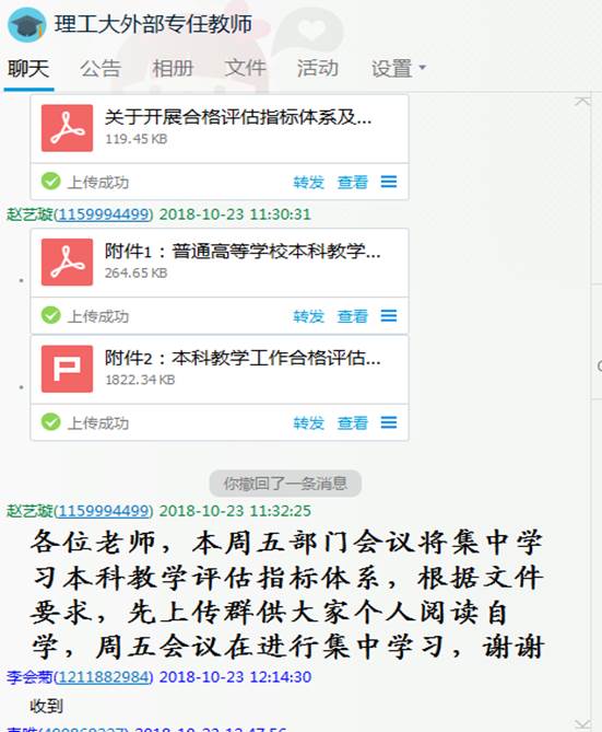 为使每位教职工深入了解本科教学工作合格评估指标体系相关知识,有效推进中国足球彩票:本科教学工作合格评估建设,形成“人人关心评估,人人参与评估”的良好氛围,现根据《中国足球彩票开展合格评估指标体系及其解读学习的通知》(贵理工评建办发〔2018〕3 号)文件要求,大外部组织全体教职工于2018年10月23日通过部门QQ群上传学习材料要求各位老师先下载研读自学,并于2018年10月26日开展集中专题学习本科教学合格评估指标体系专题学习会。